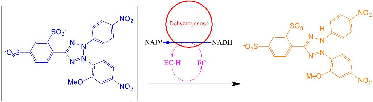 Cell Counting Kit-8(CCK)细胞增殖与活性检测试剂盒是一种基于WST-8(2-(2-甲氧基-4硝基苯)-3-(4-硝基苯)-5-(2,4-二磺基苯)-2H-四唑单钠盐),WST-8是一种类似于MTT的化合物,在电子耦合试剂存在的情况下,可以被线粒体内的一些脱氢酶还原生成橙黄色的水溶性的甲臜染料((formazan,参考图1)。WST-8被细胞内脱氢酶生物还原后生成的甲臜能够直接溶解在培养基中。细胞增殖越多越快,则颜色越深;细胞毒性越大,则颜色越浅。对于同样的细胞,生成的甲臜物的数量与活细胞的数量成正比,颜色的深浅和细胞数目呈线性关系。因此可利用这一特性直接进行细胞增殖和毒性分析。