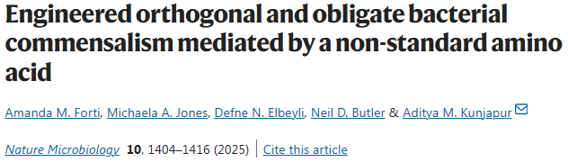 Amanda M. Forti et al, Engineered orthogonal and obligate bacterial commensalism mediated by a non-standard amino acid, Nature Microbiology (2025). DOI: 10.1038/s41564-025-01999-5.